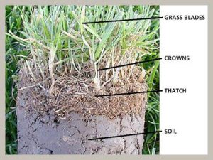 Thatch is a layer of organic matter, typically dead moss, dead or dying grass, stems, roots and other plant life, between the surface of the soil and the green living grass leaves above. In some lawns this layer can be quite thick and prevents water and nutrients from penetrating through to the soil below. Excessive thatch causes the soil to dry out and your lawn grass plants to suffer as a result. Some thatch is a good thing as it protects the soil and growing lawn. However, too much thatch is a common lawn problem that needs to be dealt with appropriately.